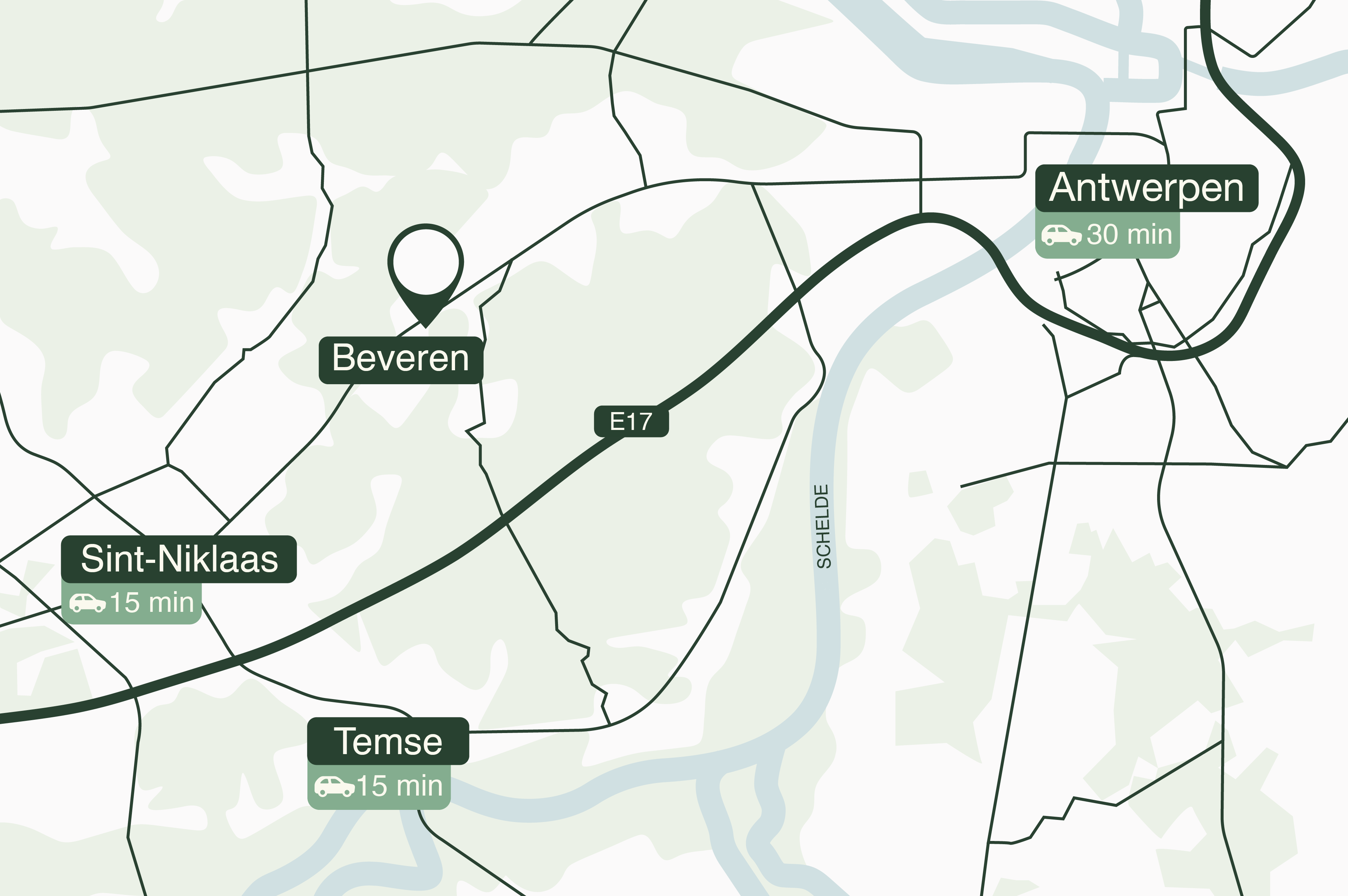 Beveren is jouw schakel tussen stad en streek. Je zit zo op de E17 richting Antwerpen of Gent, en met Station Beveren stap je rechtstreeks op de lijn tussen beide stadscentra. Daardoor blijven Sint-Niklaas, Temse, Antwerpen en Gent dagelijkse bestemmingen zonder gedoe.